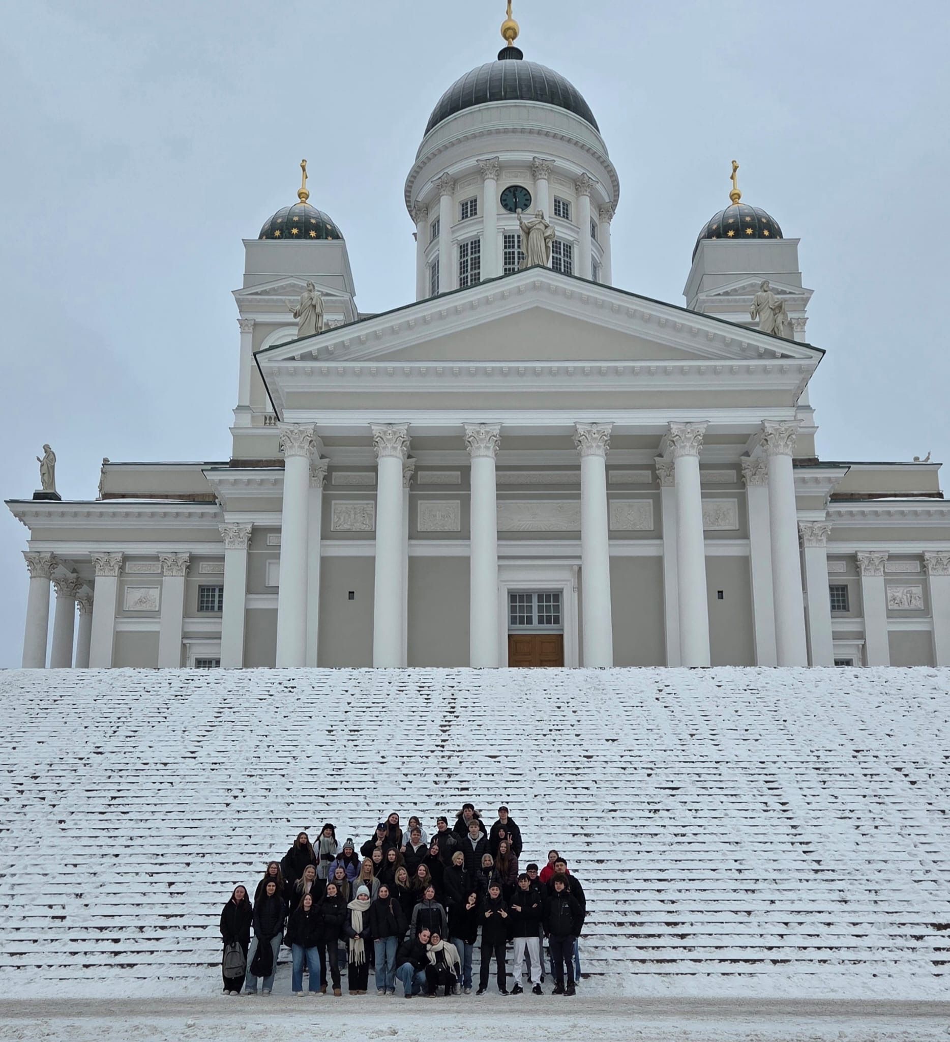 Du 17 au 24 janvier, 19 élèves de Première ont pris leur envol vers la Finlande afin de retrouver leurs correspondants, au sein d’un voyage ayant pour thème « Santé et bien-être ». Au cœur des paysages nordiques, ils ont appris à se dépasser lors d’une promenade en raquettes avant d’expérimenter la tradition finlandaise emblématique : le sauna suivi du bain glacé. Le séjour a également été une invitation à la curiosité : les élèves ont éveillé leurs papilles lors d’un atelier culinaire puis sont partis à la découverte du patrimoine finlandais en visitant la capitale Helsinki, avec son musée du design , ou encore Lahti avec le musée du ski. Cette expérience leur a également permis de découvrir le monde professionnel ainsi que l’industrie locale en bénéficiant d’une visite guidée de l’usine Halton. Un voyage inoubliable marqué par des défis personnels, de multiples découvertes ainsi que de magnifiques rencontres. « Kiitos ! »